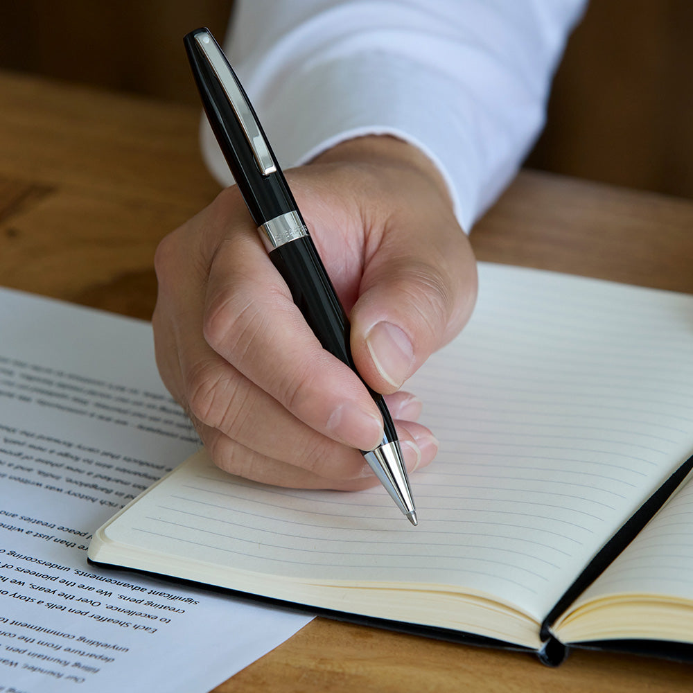 ボールペンはシガータイプの程よいボリュームのボディに高級感のあるブラックラッカー仕上げています。