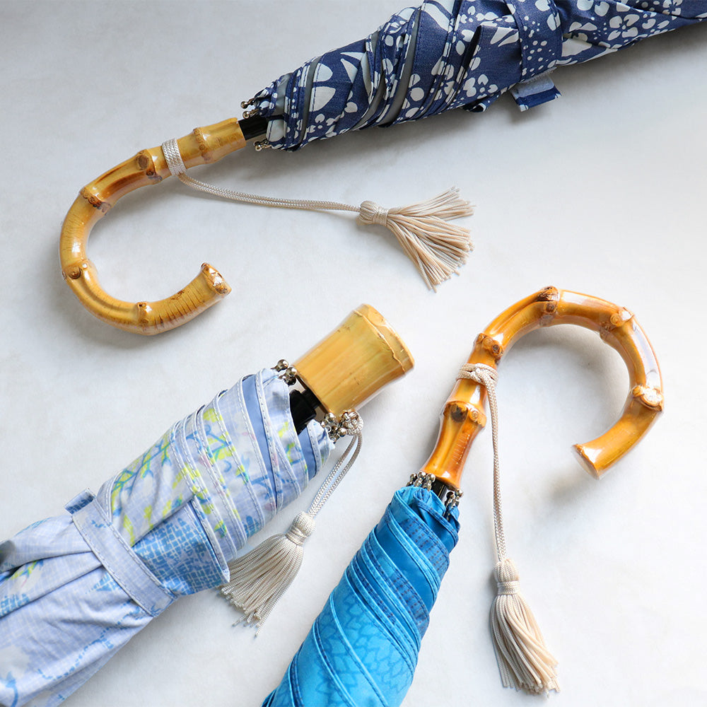 まるで着物を傘に仕立てたようなどれも目を引く素敵な和柄。和装にはもちろん洋服にも合うようにモダンなデザインにこだわっています。全柄に日本伝統色が1色使われており、柄にも名前がついていて選ぶのも楽しくなります。