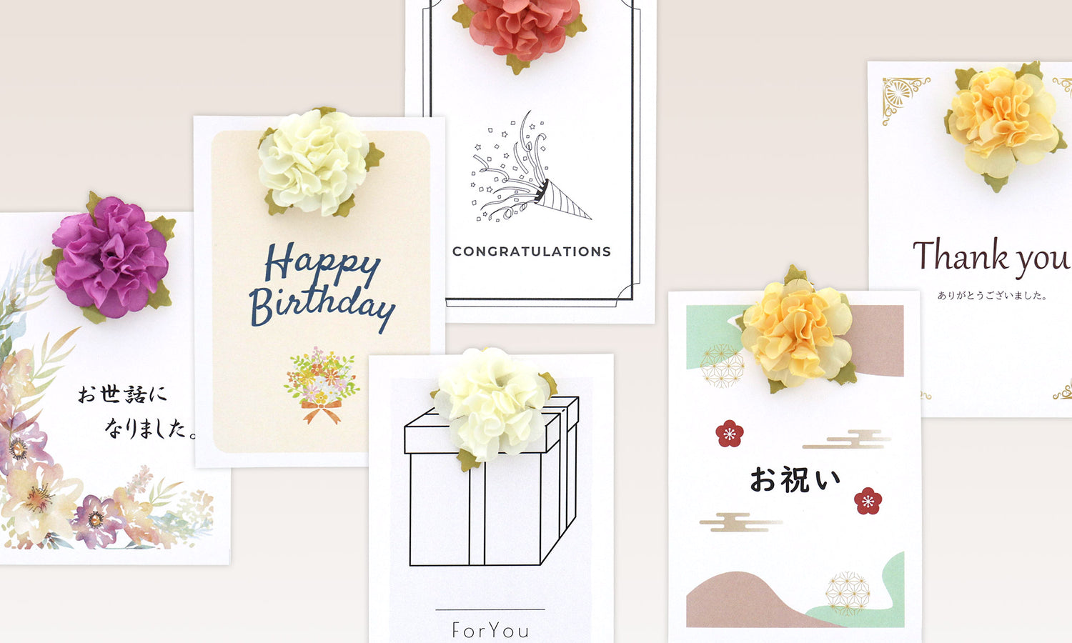 立体的なお花で飾ったメッセージカードは、より華やかにプレゼントを演出します。ギフトをお送りの際はぜひご利用ください。