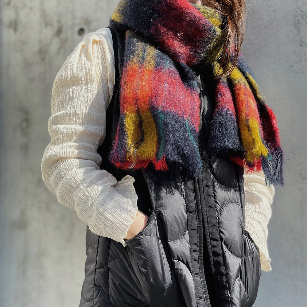 - ふんわりボリューム。70%モヘア配合、肌触り柔らかなマフラー。